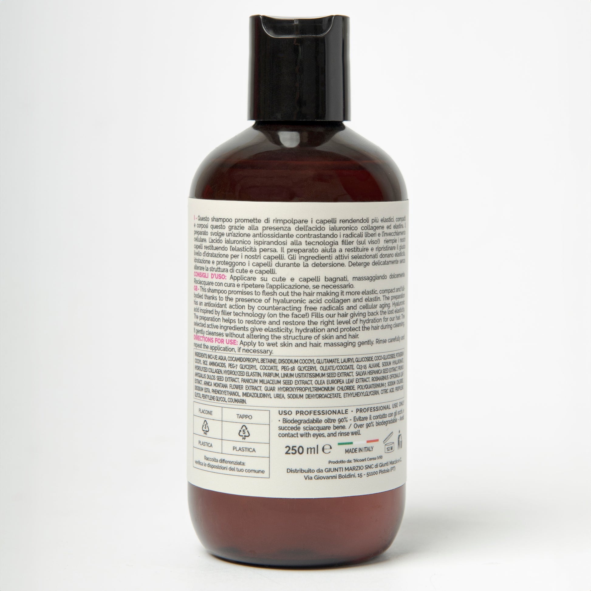 IT - Capelli nutriti, leggeri, splendenti. Un rituale di bellezza con acido ialuronico, collagene ed elastina che deterge con delicatezza, idrata in profondità e dona ai capelli forza, morbidezza e luminosità.