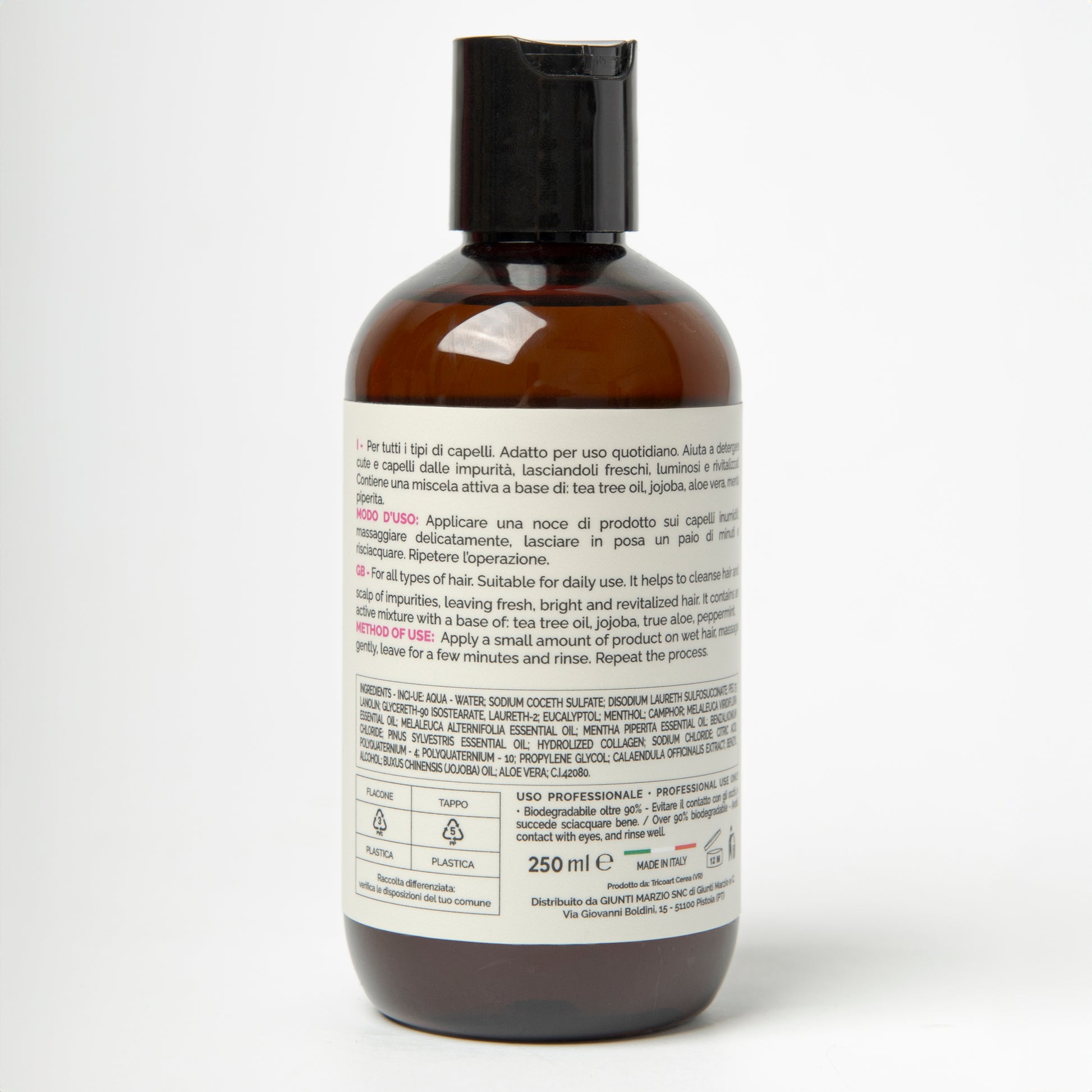 INGREDIENTI: Acqua - water; sodio coceth sulfate; disodio laureth sulfosuccinate; peg-75 lanolina; glicereth-90 isostearato, laureth-2; eucaliptolo; mentolo; canfora; olio essenziale di melaleuca viridiflora; olio essenziale di menta piperita; cloruro di benzalconio; olio essenziale di pino silvestre; collagene idrolizzato; cloruro di sodio; acido citrico; polyquaternium-4; polyquaternium-10; glicole propilenico; estratto di calendula officinalis; 2-bromo-2-nitropropano-1,3-diolo; olio di buxus chinensis (jojoba); aloe vera; c.i.42080